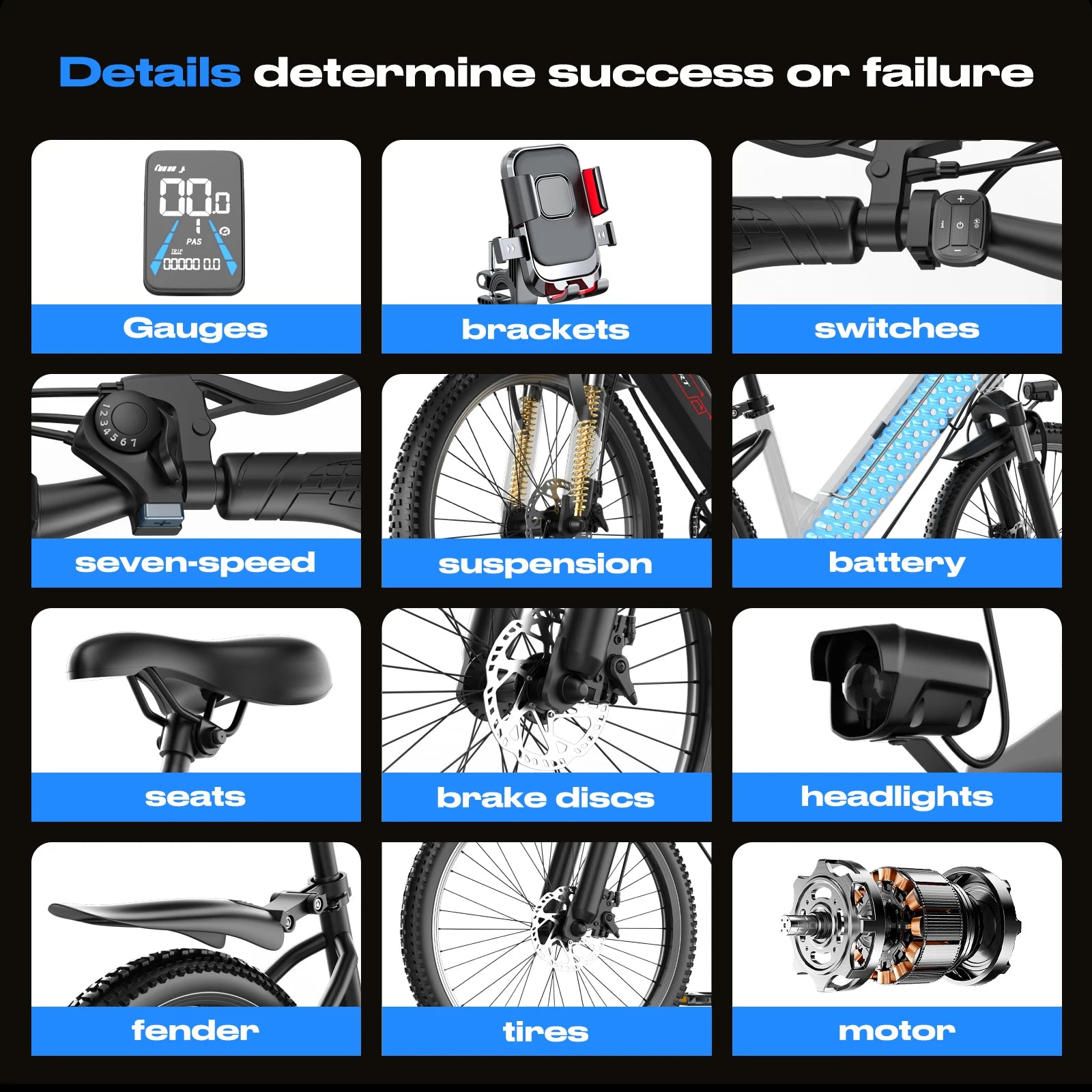 - Five riding modes (pedal assist, throttle, cruise, pedal only, walk assist) paired with a 7-speed drivetrain and 26" puncture-resistant tires for precise control across trails and city streets.